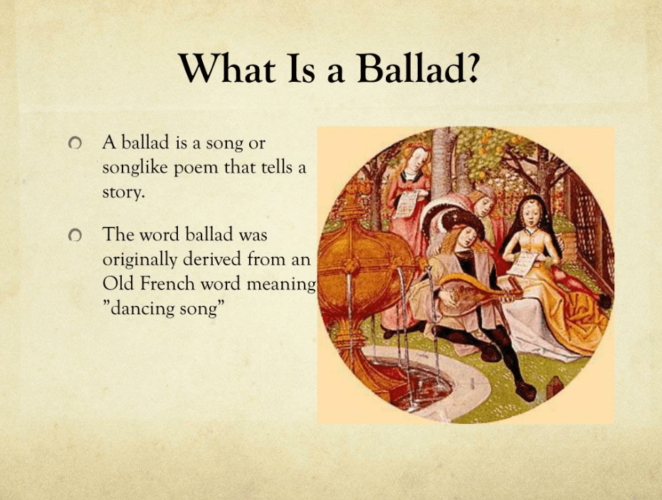 The traditional ballad was performed in dance halls in time with the music, and the term ultimately derives from the Latin word ballāre meaning “to dance.” It is also the origin of the word Ballet. French popularised it in 13th century as Balladee. French also introduced Ballade – as a form of dance music during 13th century. This form of narrative poem is structured with an unspecified number of rhymed quatrains (four-line stanzas). The lines were often quite simple with three or four stresses. Usually the second and fourth lines rhymed, but there were many variations of the ballad making it difficult to define. During the medieval period, the wandering minstrels used the ballad structure for their songs. Ballads about Robin Hood were sung during the 14th century medieval England.