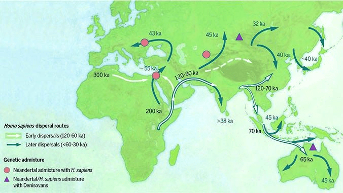 A group of them or a few groups of them eventually made it to the north-west of the Indian subcontinent – maybe even Indus valley. I suspect they were not surprised to find the archaic humans – Erectus or Neanderthals or Hiedelbergensis or Denisovians or even some as yet to be identified humans well established in the sub-continent. Particularly in the peninsular India. Their wanderings have been identified in two routes – one a sub-Himalayan route east and down the eastern archipelago towards Australia by hopping on hundreds of islands. Yet another group took to the coastal route along the west coast of the deccan towards the tip and back up the east coast. We did not have any direct evidence of archaic humans in India till the discovery of part of a skull in Narmada basin recently. It is not clear to which species it belongs to – just that it was not a Sapiens. It has been given a name of Homo Erectus Narmadensis. We have plenty of evidence of their presence in the form of tools they left behind. The artefacts underneath the huge deposit of ash deposited by the Toba eruption around 71 thousand years ago at Jwalapuram in Andhra Pradesh were left by the archaic humans. It is unlikely to have belonged to the homo sapiens as they did not reach India till about 60 to 70 thousand years ago. Unfortunately, no skeletal remains were found.