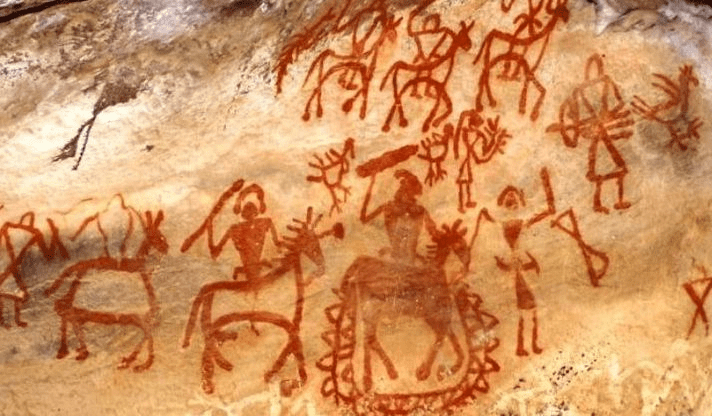 The magnificent cave paintings of Bhimbetaka in Madhya Pradesh are an ancient version of a social media trail of human beings dating back to around 35 to 40 thousand years ago. These paintings have been grouped into various periods depending on the drawings. We can see the first religious signs, at least in one figure of a man holding a trident – called a Nataraja or dancing Shiva.